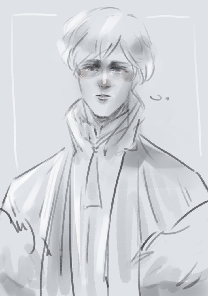 パッと見た時は「わ~なんだかだぶだぶな大きめコート着てらっしゃる~可愛い~~~~~~~~~~~~~~~~~∞」と思ってたんだけど、描くにあたってよくよく見てみたらこれ大きめというか肩まで…下がってます???あえての下げての萌袖にしてます??????は????可愛すぎか??????ま、魔性…..っ!!!!!!_:(´ཀ`」 ∠):